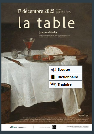 Journée d’études organisée par les étudiants en M1 Renaissance du CESR sous la conduite de Claire Sicard et Pascale Charron La journée d’études abordera les thèmes suivants : -Montrer la table -L’art de bien manger -Des tables prestigieuses Intervenants : Fanny Freminé-Garcia, doctorante en histoire de l’art (CESR, université de Tours), Pierre-Gilles Girault, conservateur en …