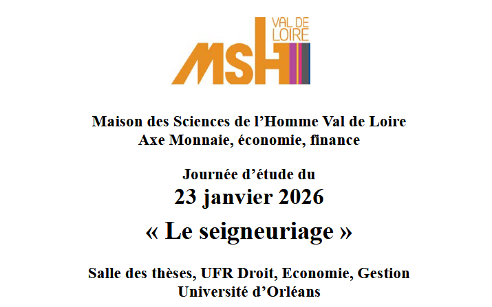L’Axe Monnaie, économie, finance de la MSH Val de Loire organise le 23 janvier 2026 (9h30-16h) à Orléans une journée d’étude sur le thème “Le Seigneuriage”. Programme : 9h30 – Accueil 10h – Marc Bompaire (CNRS et EPHE, IRAMAT) Le prélèvement sur le monnayage à l’époque médiévale. La naissance du seigneuriage 11h – Jérôme Jambu …