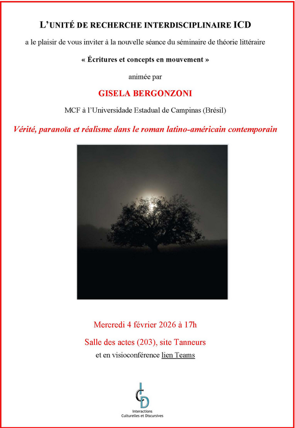 L’unité de recherche interdisciplinaire, ICD, présente “Écritures et concepts en mouvement” animée par Gisela Bergonzoni (MCF à l’Universidade Estadual de Campinas Brésil) Informations et Lien visio Dans ce séminaire, nous nous proposons de réfléchir à certains dilemmes auxquels nous faisons face aujourd’hui – tels que la diffusion de la post-vérité et de la paranoïa comme …