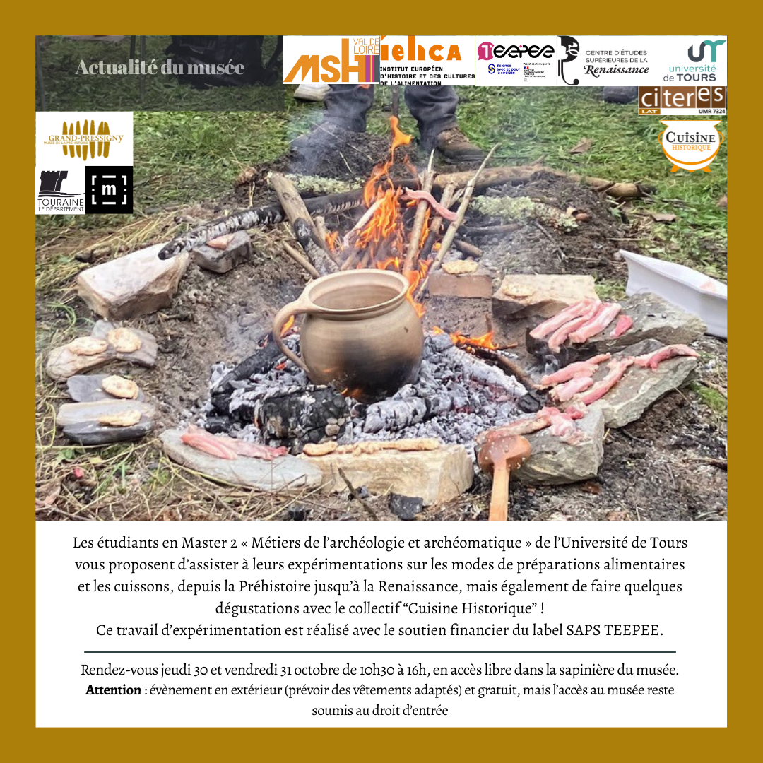 Avec la participation des étudiants en Master 2 « Métiers de l’archéologie et archéomatique » de l’Université de Tours et le Collectif Cuisine Historique, expert en gastronomie et cuisine historique. Ce travail expérimentation est réalisé avec le soutien financier du label SAPS TEEPEE.