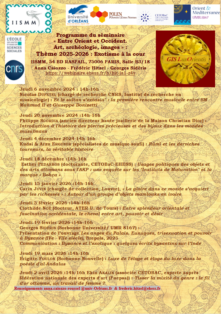Proposé par Anna Caiozzo – Frédéric Hitzel – Georges Sidéris dans le cadre du Séminaire “Entre Orient et Occident. Art, archéologie, images” Thème de 2025-2026 : Exotisme à la cour