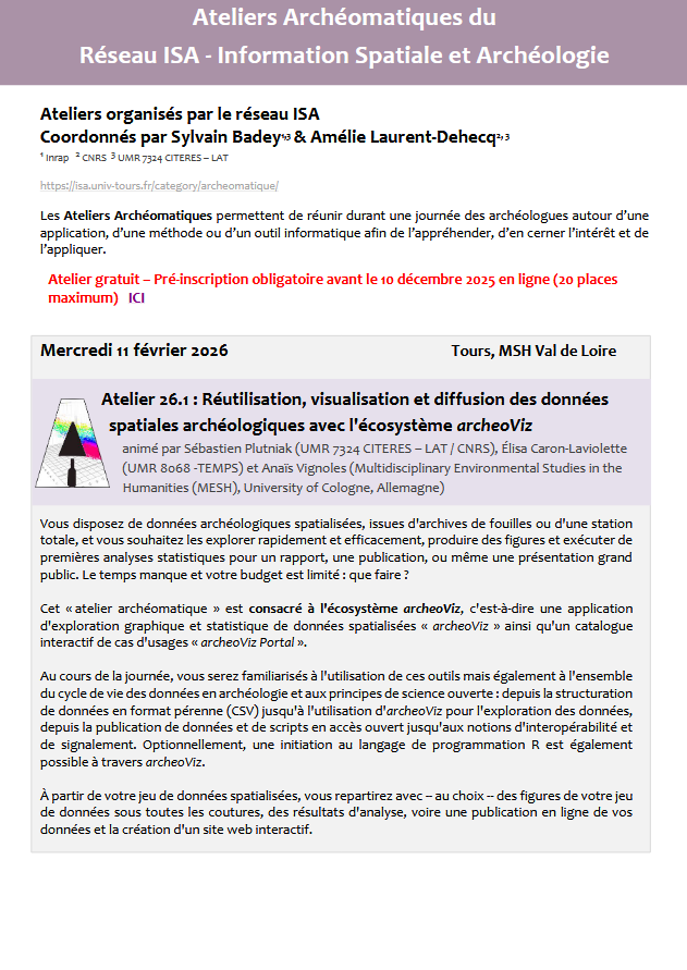 Animé par Sébastien Plutniak (UMR 7324 CITERES – LAT / CNRS), Élisa Caron-Laviolette (UMR 8068 -TEMPS) et Anaïs Vignoles (Multidisciplinary Environmental Studies in the Humanities (MESH), University of Cologne, Allemagne) Les Ateliers Archéomatiques permettent de réunir durant une journée des archéologues autour d’une application, d’une méthode ou d’un outil informatique afin de l’appréhender, d’en cerner …