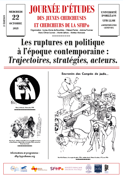 Journée d’études des jeunes chercheuses et chercheurs de la SFHPo. L’actualité illustre l’importance des phénomènes de rupture dans la vie politique. Alors que les césures politiques majeures (changements de régime, mouvements de contestations…) ont été l’objet de nombreuses études, celles intervenant au sein des familles politiques ont été moins traitées, laissant des problématiques à explorer. …