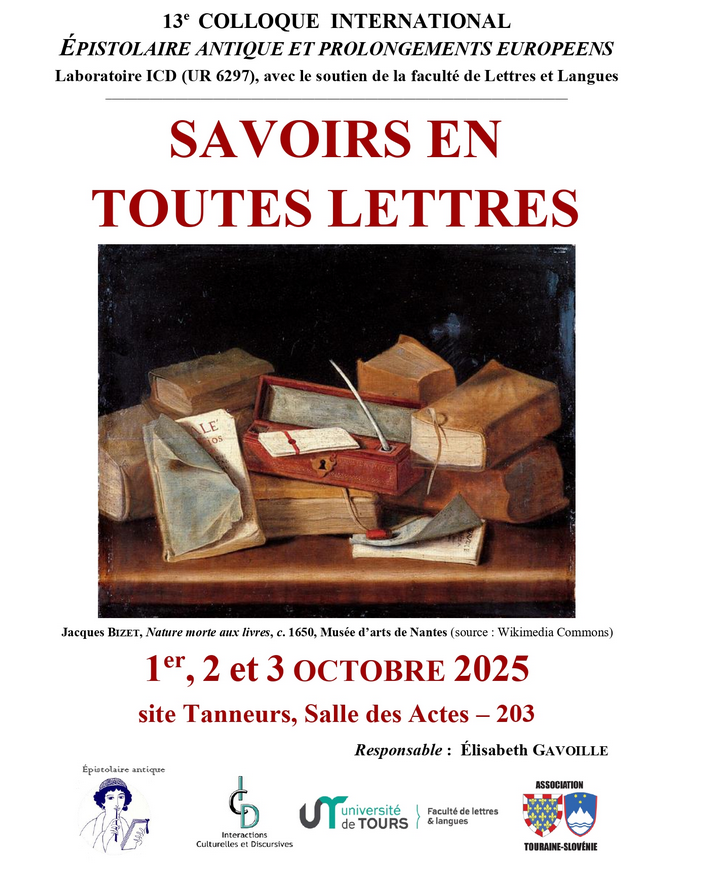 13ième colloque international – Épistolaire antique et prolongements européens, organisé par Élisabeth Gavoille (ICD) avec le soutien de la faculté de Lettres et Langues Ce colloque s’inscrit dans une série traditionnelle: le collectif de recherches sur “L’épistolaire antique et ses prolongements européens”, créé par les latinistes de l’U. de Tours, organise depuis 1998 des colloques interdisciplinaires sur la …