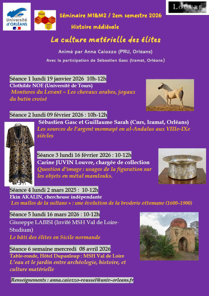 Dans le cadre du séminaire “Histoire médiévale “La culture matérielles des élites” Animé par Anna Caiozzo (PRU, Orléans) et avec la participation de Sébastien Gasc (Iramat, Orléans) Séance 3 > lundi 16 février 2026 [10-12h] Carine JUVIN Louvre (chargée de collection) : “Question d’image : usages de la figuration sur les objets en métal …