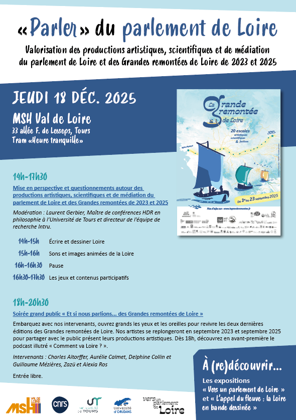 Membre du collectif “Vers un parlement de Loire”, la MSH Val de Loire organise une journée autour de la valorisation des productions artistiques, scientifiques et de médiation du parlement de Loire et des Grandes remontées de Loire de 2023 et 2025. Programme 14h-17h30 : Mise en perspective et questionnements autour des productions artistiques, scientifiques et …
